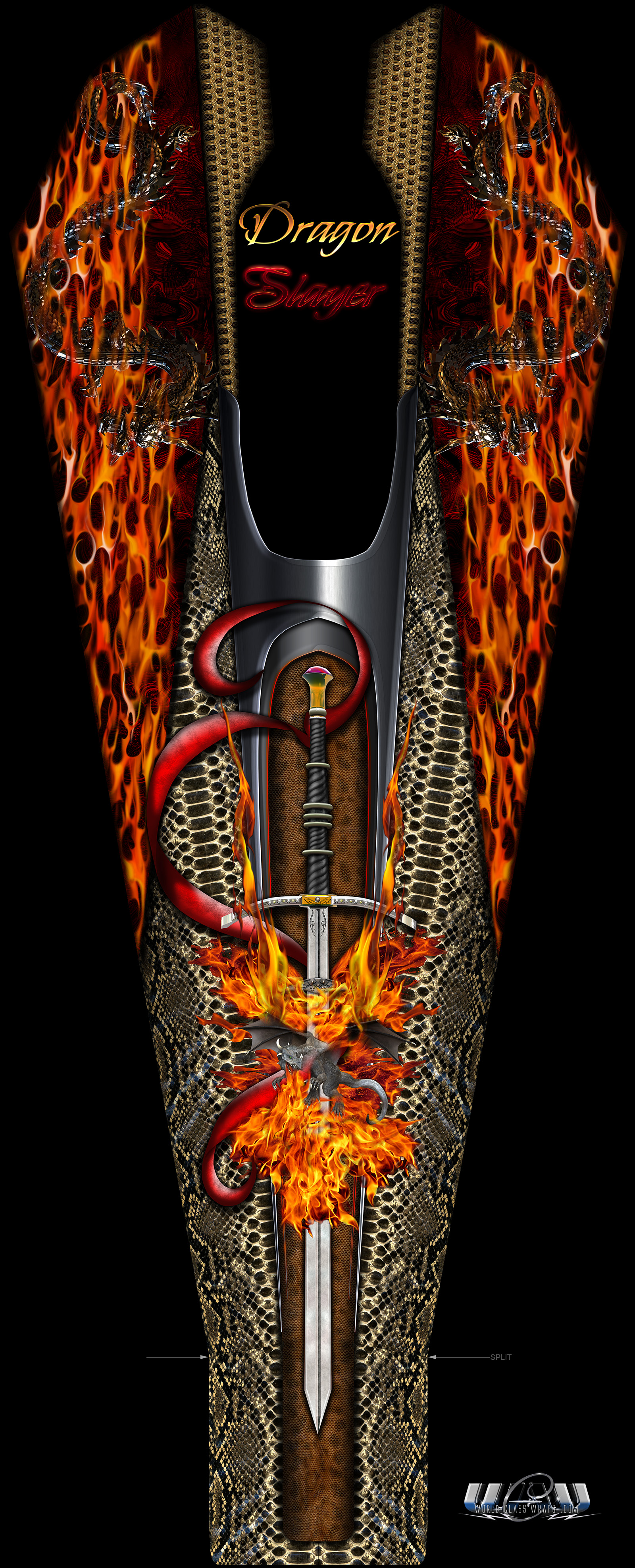The 1:1 Dragon Slayer design seen within this presentation is digitally produced in full scale to fit the body.